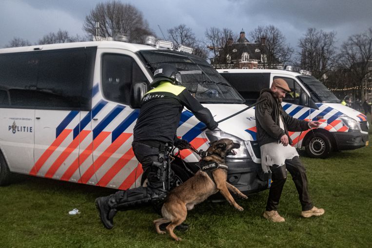 Op en rond het museumplein was veel politie om de betoging in goede banen te leiden.